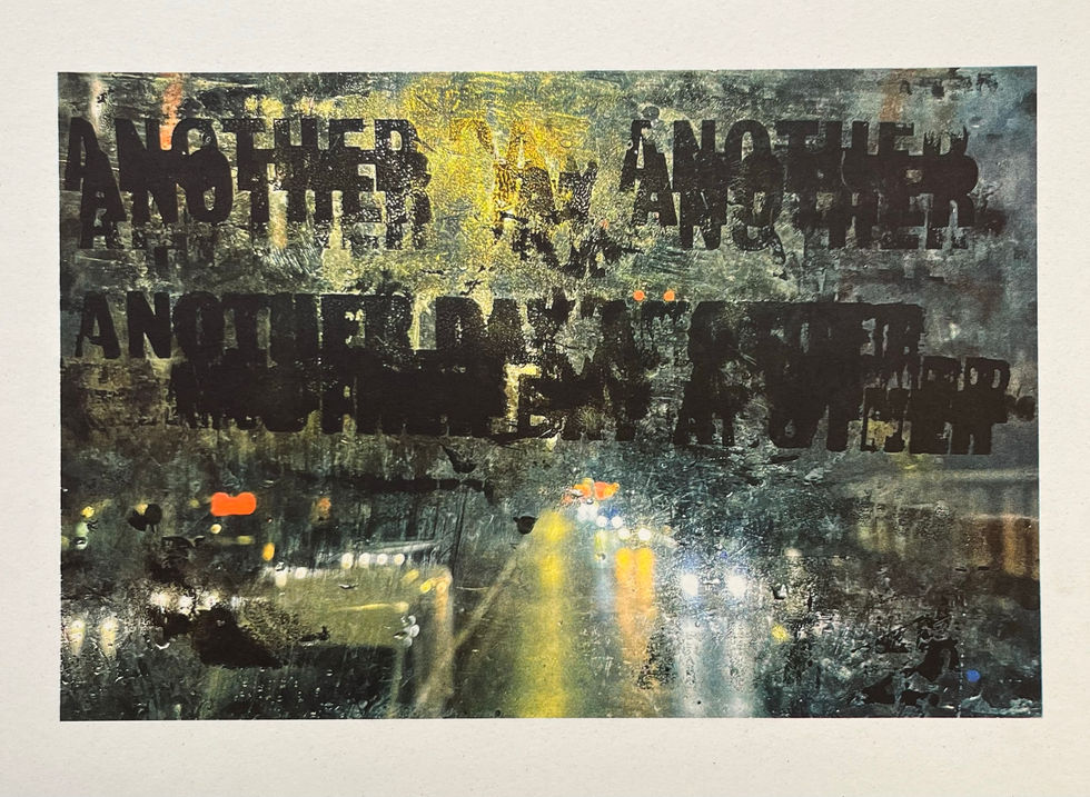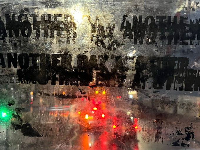 As I enjoyed this aesthetic I decided I would work to purposely create marks this way. I then took the acetate from the screen printing workshop and brought it outside. I began holding the acetate in front of different surfaces, before photographing them and making prints from the result. That day, as it was raining heavily, I took the bus to work and decided to bring the acetate and stick it to the inside of the windows, so that I could photograph behind it the world working around me, juxtaposed with the phrase 'ANOTHER DAY ANOTHER'.